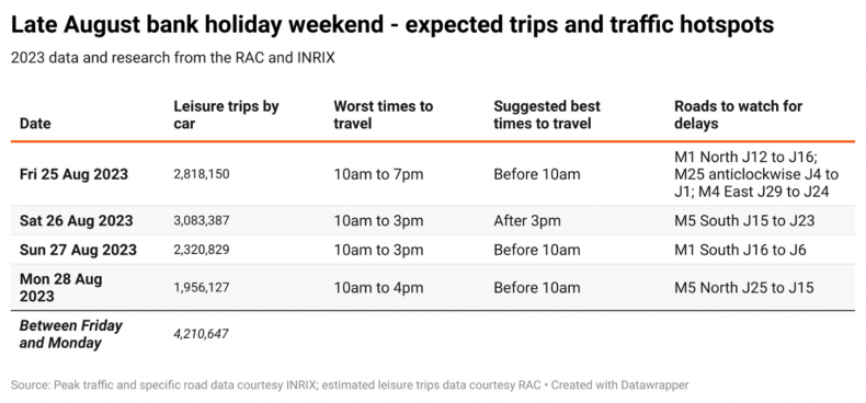 Friday is forecast to be the next busiest with 2.8m trips planned, followed by Sunday with 2.3m, while the bank holiday Monday is predicted to see 1.9m. On top of these estimates are another 4.2m trips which will be made at some point over the course of the three-day weekend by drivers who have yet decide which day to travel on.