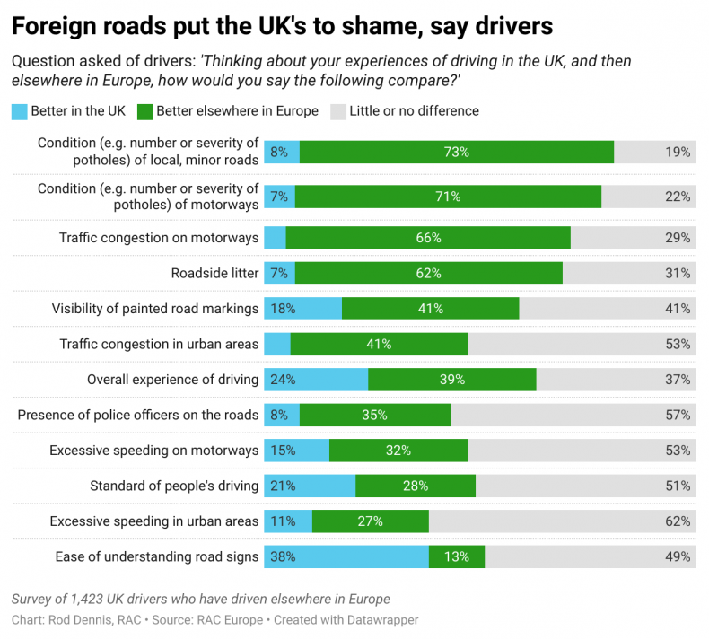 As many as 72% of drivers who have experience of driving abroad think the condition of roads – such as the number and severity of potholes – is worse in the UK than in other countries, with just 8% saying the UK fares better.