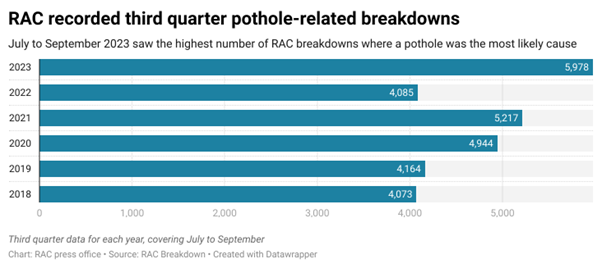 RAC recorded pothole-related breakdowns – third quarter, July to September